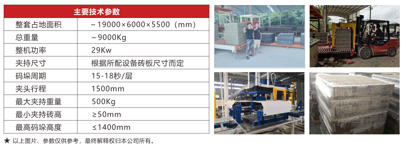 QS-1000G-B型簡(jiǎn)易式碼垛系統(tǒng)適用于配套出磚托板成型制品合并后接近于方形或者兩板合并接近于方形的無(wú)需 分磚可直接磚板分離碼垛。設(shè)備包含進(jìn)板機(jī)、升板機(jī)、推板機(jī)、、龍門(mén)式高位碼垛機(jī)、重型鏈?zhǔn)捷斔蜋C(jī)、電控系統(tǒng)、 液壓系統(tǒng)等。